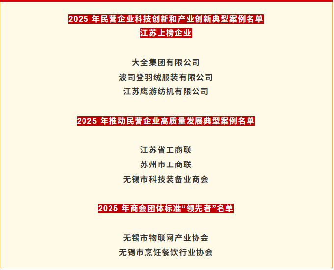會(huì)上,發(fā)布了2025研發(fā)投入前1000家民營(yíng)企業(yè)創(chuàng)新狀況報(bào)告和民營(yíng)企業(yè)研發(fā)投入、發(fā)明專利榜單,民營(yíng)企業(yè)發(fā)展新質(zhì)生產(chǎn)力系列典型案例、商會(huì)團(tuán)體標(biāo)準(zhǔn)“領(lǐng)先者”名單。其中,江蘇77家民營(yíng)企業(yè)入圍“2025民營(yíng)企業(yè)研發(fā)投入500 家”、62家民營(yíng)企業(yè)入圍“2025民營(yíng)企業(yè)發(fā)明專利500 家”;大全集團(tuán)有限公司、波司登羽絨服裝有限公司、江蘇鷹游紡機(jī)有限公司3家企業(yè)入選“2025年民營(yíng)企業(yè)科技創(chuàng)新和產(chǎn)業(yè)創(chuàng)新典型案例名單”;江蘇省工商聯(lián)、蘇州市工商聯(lián)、無(wú)錫市科技裝備業(yè)商會(huì)3家單位入選“2025年推動(dòng)民營(yíng)企業(yè)高質(zhì)量發(fā)展典型案例名單”;無(wú)錫市物聯(lián)網(wǎng)產(chǎn)業(yè)協(xié)會(huì)、無(wú)錫市烹飪餐飲行業(yè)協(xié)會(huì)2家商會(huì)標(biāo)準(zhǔn)入選2025年商會(huì)團(tuán)體標(biāo)準(zhǔn)“領(lǐng)先者”名單。江蘇上榜企業(yè)和單位數(shù)量均位居前列。