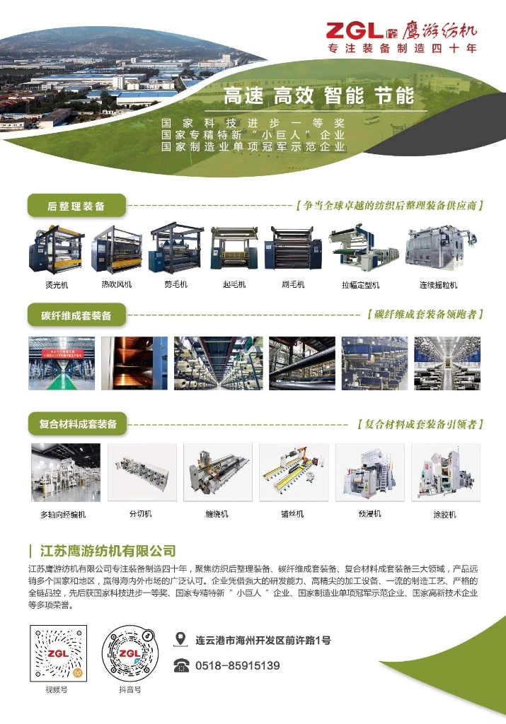 江蘇鷹游紡機有限公司專注裝備制造四十年,聚焦紡織后整理裝備、碳纖維成套裝備、復(fù)合材料成套裝備三大領(lǐng)域,產(chǎn)品遠銷多個國家和地區(qū),贏得海內(nèi)外市場的廣泛認可。企業(yè)憑借強大的研發(fā)能力、高精尖的加工設(shè)備、一流的制造工藝、嚴(yán)格的全鏈品控,先后獲國家科技進步一等獎、國家專精特新“小巨人”企業(yè)、國家制造業(yè)單項冠軍示范企業(yè)、國家高新技術(shù)企業(yè)等多項榮譽。