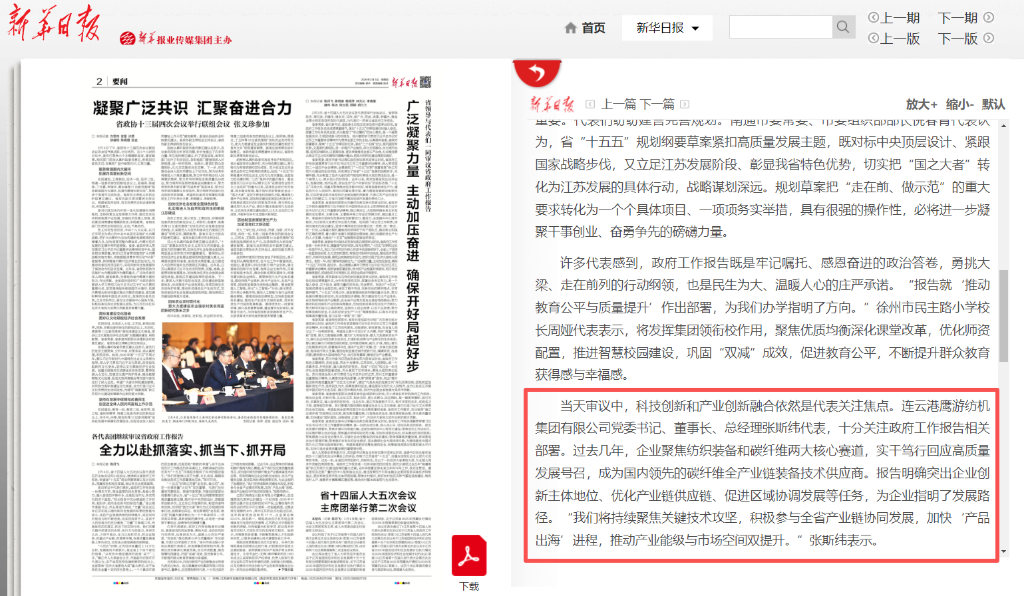 針對(duì)下一步發(fā)展,張斯緯表示,將第一時(shí)間傳達(dá)落實(shí)省兩會(huì)精神,立足企業(yè)自身優(yōu)勢(shì),重點(diǎn)做好三方面工作:一是持續(xù)聚焦關(guān)鍵技術(shù)攻堅(jiān),加大研發(fā)投入,加快尖端碳纖維配套裝備研制,筑牢創(chuàng)新發(fā)展根基;二是積極參與全省產(chǎn)業(yè)鏈協(xié)同發(fā)展,發(fā)揮龍頭企業(yè)帶動(dòng)作用,助力本地中小企業(yè)共同進(jìn)步,推動(dòng)形成梯次發(fā)展、協(xié)同發(fā)力的產(chǎn)業(yè)格局;三是加快“產(chǎn)品出?!边M(jìn)程,拓展新興應(yīng)用場(chǎng)景,推動(dòng)產(chǎn)業(yè)能級(jí)與市場(chǎng)空間雙提升,助力江蘇外貿(mào)高質(zhì)量發(fā)展。他明確,這些舉措將切實(shí)把報(bào)告部署轉(zhuǎn)化為企業(yè)發(fā)展實(shí)效,為江蘇新材料產(chǎn)業(yè)“走在前”、外貿(mào)高質(zhì)量發(fā)展多作貢獻(xiàn)。